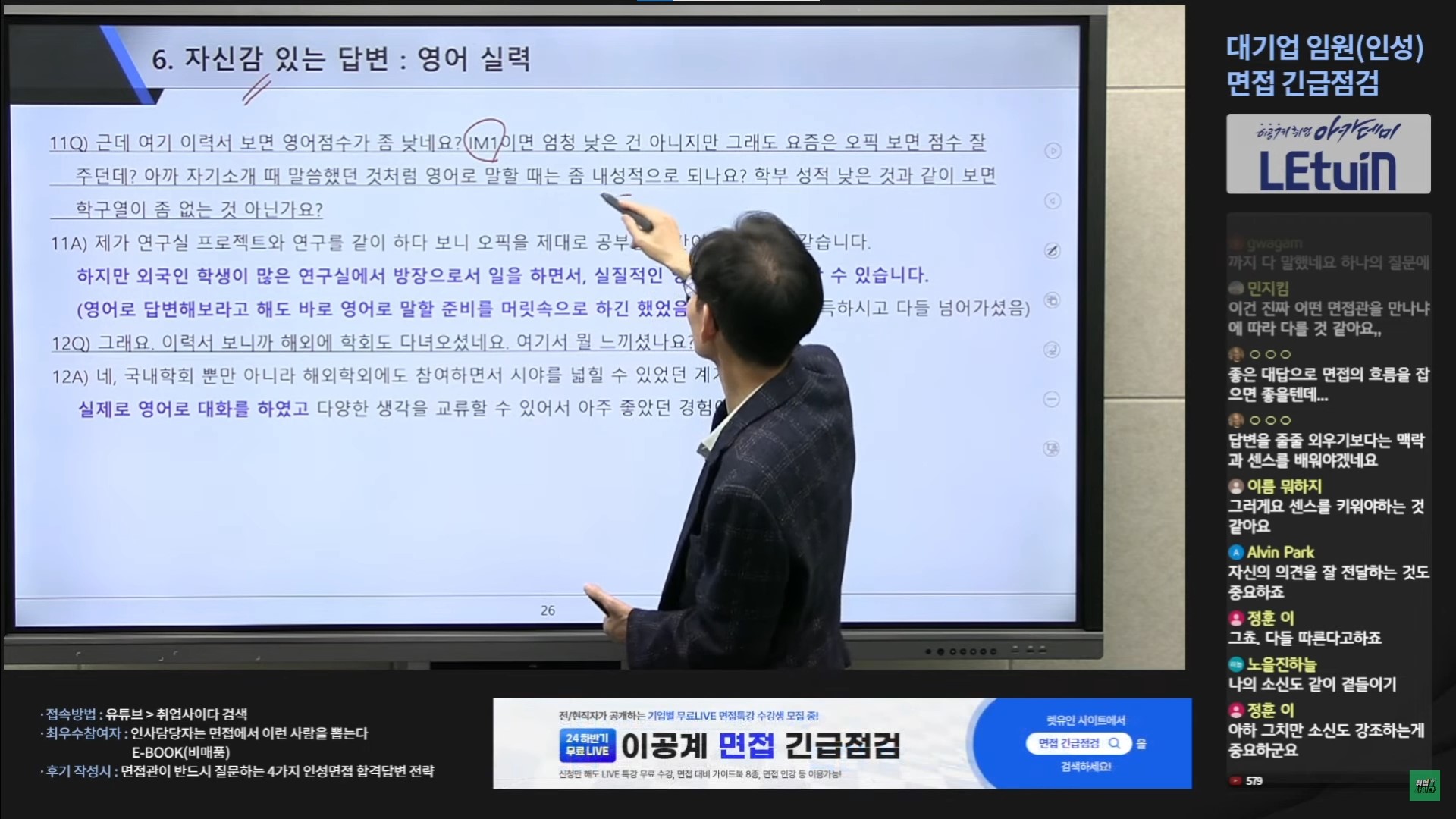 한 사례를 들어서 어떻게 답변해나갔는지 분석해주신 점이 정말 좋았습니다. 앞으로 면접을 준비해 나가는데 큰 도움이 될 것 같습니다. 생방송 시청 인증 이미지