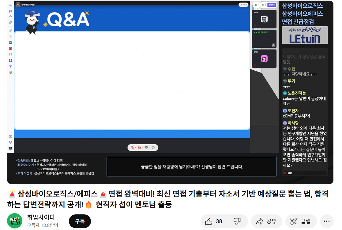 삼성바이오로직스의 직무 면접에 대한 전반적인 내용. pt면접의 기출 문제와 답변에 대해서 말씀주셨습니다. 다들 면접이 어떻게 진행되는지에 대해 관심이 많고 질문도 많았는데 그에 대한 답변도 잘 해주셨습니다.