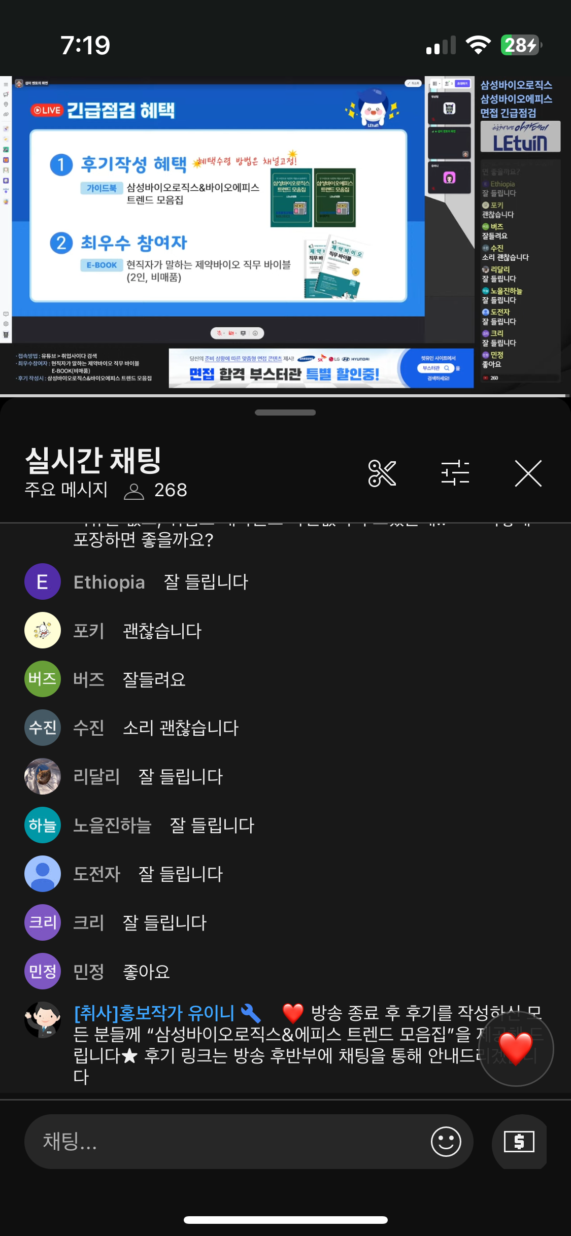 강의 내용을 토대로 전공을 공부하고 직무 면접을 대비하려고 합니다 한시간이지만 알찼던 시간이었습니다 감사합니다 생방송 시청 인증 이미지