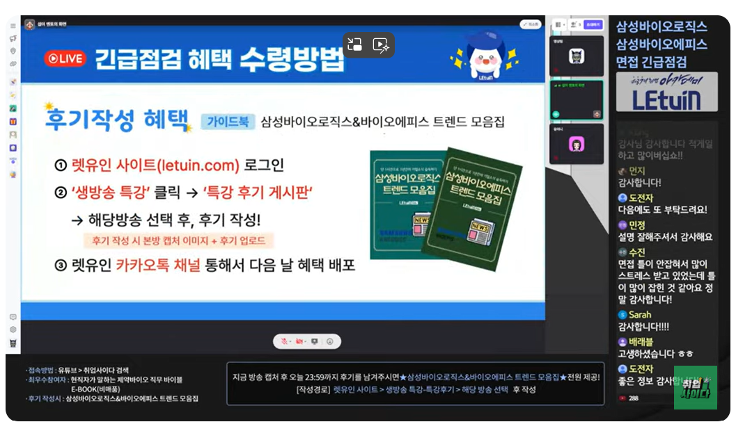 정보가 부족한 상황에 실제 문제들과 답변 예시들을 말씀해주셔서 준비하는데 큰 도움이 될 것 같습니다. 추가로 직무 면접에 한정되지 않고, 영어 면접이라던지 다른 준비사항에 대해 말씀해주신것도 좋았습니다. 생방송 시청 인증 이미지