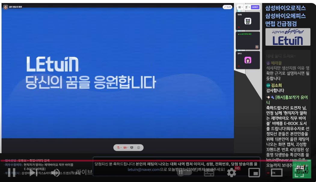 면접이 어떻게 진행될지 아예 감이 없었는데 이번 특강으로 준비 열심히 하겠습니다. 생방송 시청 인증 이미지