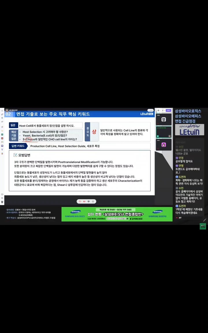 우선 면접 진행 방식을 먼저 설명해주셨습니다. 그다음 삼성바이오로직스와 에피스에서 나왔던 면접기출 문제들과 예상 문제들을 설명해주셨습니다. 그 후 Q&A 시간을 가지며 생방송을 마쳤습니다.