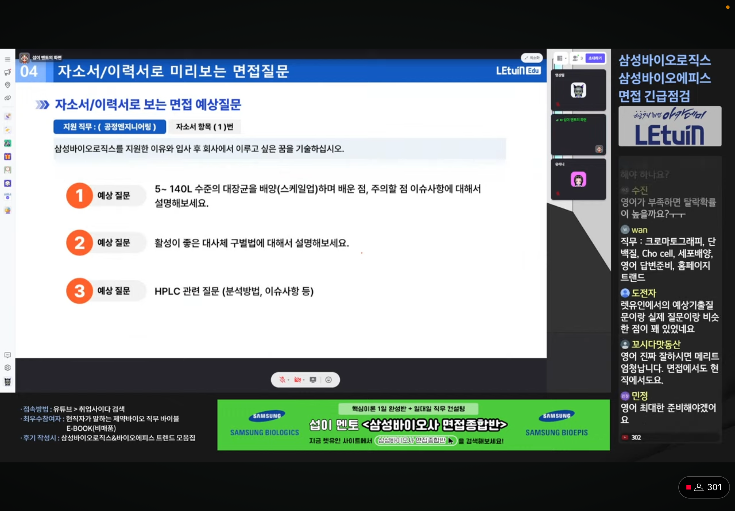 삼성바이오로직스 면접 절차를 설명해 주신 후 pt 기출문제를 알려주셔서 어떤 부분을 삼성바이오로직스가 중요하게 생각하고 있는 지 알 수 있는 좋은 기회였어요 더불어 직무문제풀이시간이 단순히 문제풀이가 아니라 인성도 함께 본다는 점을 새롭게 알았습니다.