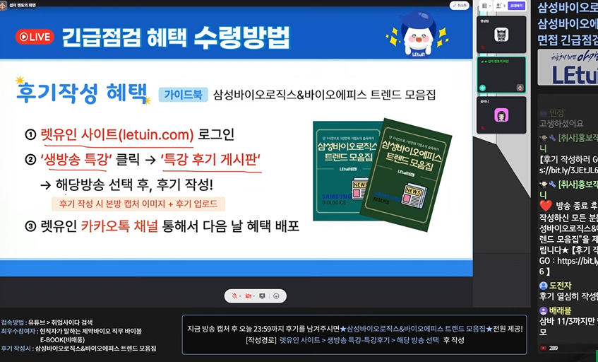 인성 면접 기출 질문에 대해선 다양한 매체를 통해 접할 수 있었지만, 직무 면접에서 어떤 질문들이 나오는 지 막막했습니다. 그런데 이번 특강을 듣고 어떤 문제들이 나왔는지, 어떤 부분을 중점적으로 공부해야 하는지 알게 되었습니다. 렛유인과 섭이님께 진심으로 감사드려요! 생방송 시청 인증 이미지
