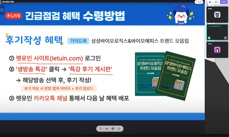 감을 잡을수있었습니다. 특강떄 알려주신 부분들 잘 참고해서 좋은결과가 나오면 좋겠습니다. 면접준비가 막막했었는데 도움이 많이 되서 감사합니다. 생방송 시청 인증 이미지