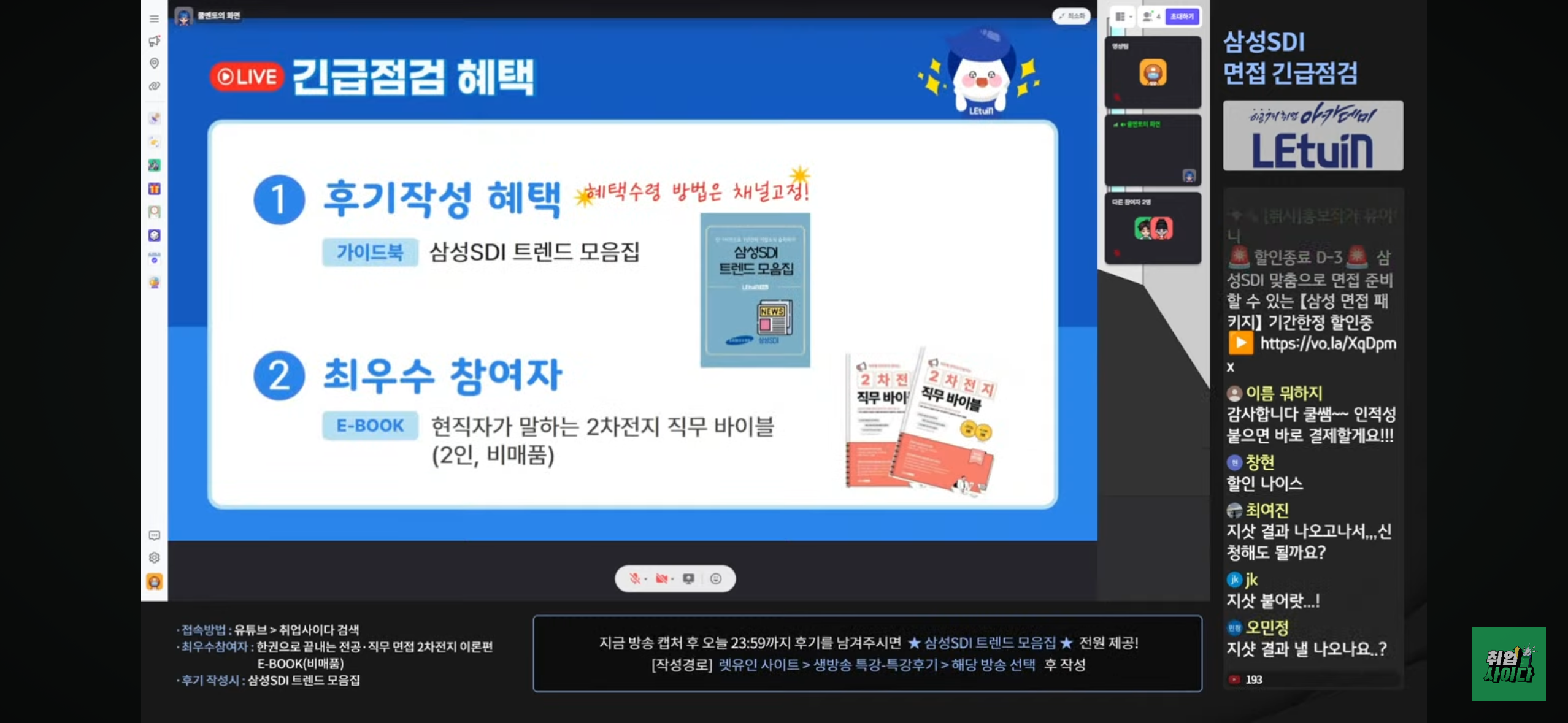 꼬리질문 중요하다고 설명해주셨고 직무 면접의 경우 어떻게 준비해야하는지 명확한 예시를 포함해서 설명해주셨습니다. 자소서 내용을 다시 확인하고 키워드 뽑아서 면접 준비를 해야할 듯 합니다. 생각보다 많이 준비해야할 것 같다는 생각이 들었습키다. 생방송 시청 인증 이미지