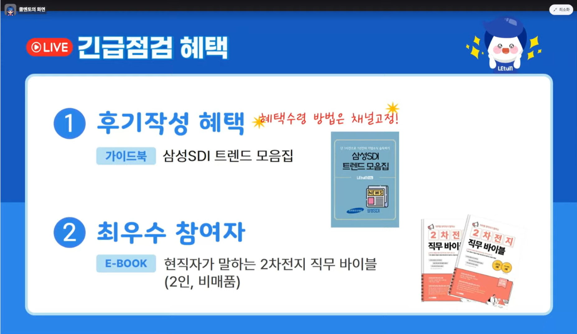 SDI 면접 준비를 해야 한다고 생각했지만 준비할 부분이 너무 많다고 느껴서 방향성을 잡지 못하고 있었습니다. 하지만 본 특강을 통해 어떠한 부분을 준비해야하고, 전공 지식은 어떠한 방향으로 정리를 해야할지 감을 잡을 수 있었던 것 같습니다. 특강 내용을 바탕으로 면접 준비 열심히 하여 최종 합격 해보겠습니다!
