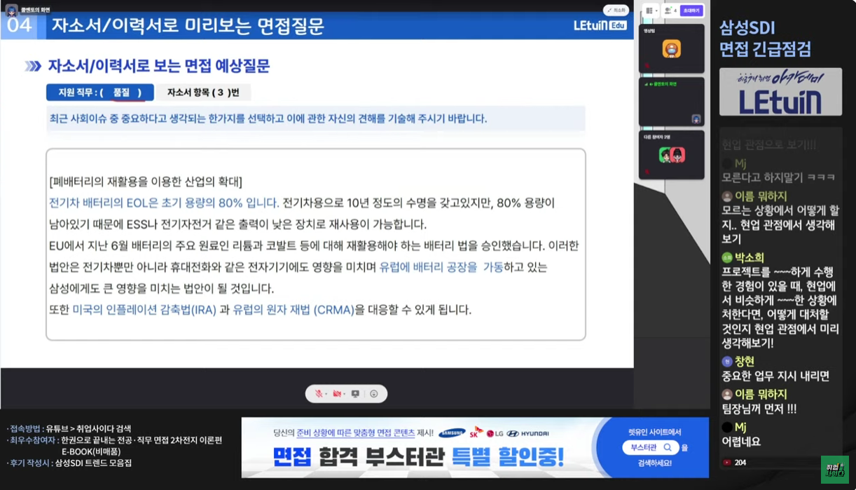 직무 면접의 특징으로는 크게 '직무 연관성', '직무/전공' 관련지식 , '산업' 이해도로 나뉘는 것과 더불어 세세하게 관련 질문들과 답변에 대해 설명해주셨습니다. 또한 삼성 SDI 주요 사업과 이슈에 대한 키워드를 알려주셨습니다.