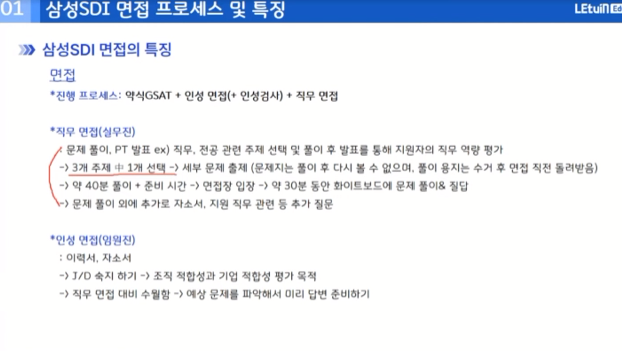 삼성 sdi 채용 프로세스에 면접의 경우 인성면접과 직무면접으로 이루어져 있고 직무면접은 문제풀이나 PT 형식으로 진행되며 문제풀이의 경우 약 40분의 풀이와 약 30분의 발표로 진행됩니다.