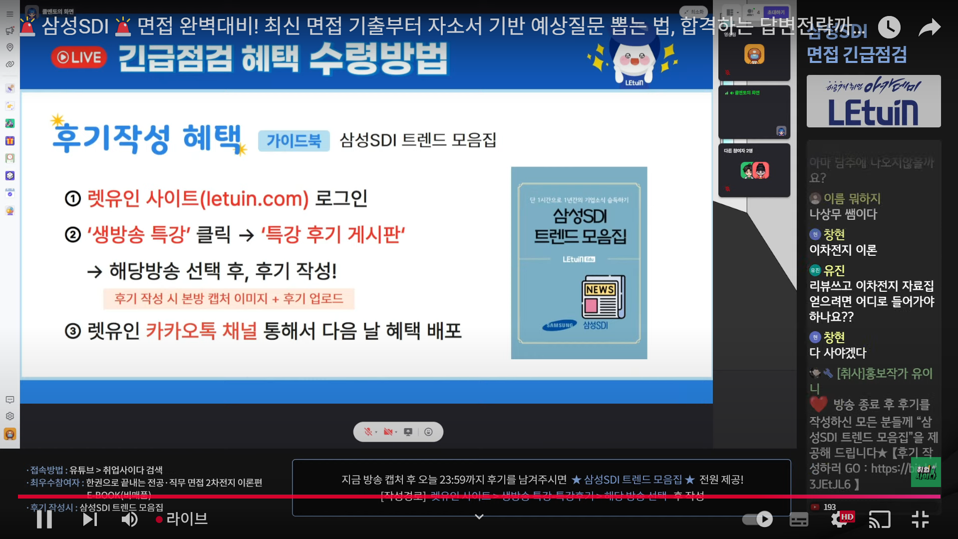 삼성 SDI 현직자이신 멘토님께서 준비 팁을 많이 알려주셔서 너무 도움이 되었습니다. 배터리 주요 키워드나, 예상 질문 등을 설명해주시면서 막연했던 면접에 대해서 .. 앞으로 어떻게 대비해야할지 방향을 캐치할 수 있었습니다. 생방송 시청 인증 이미지