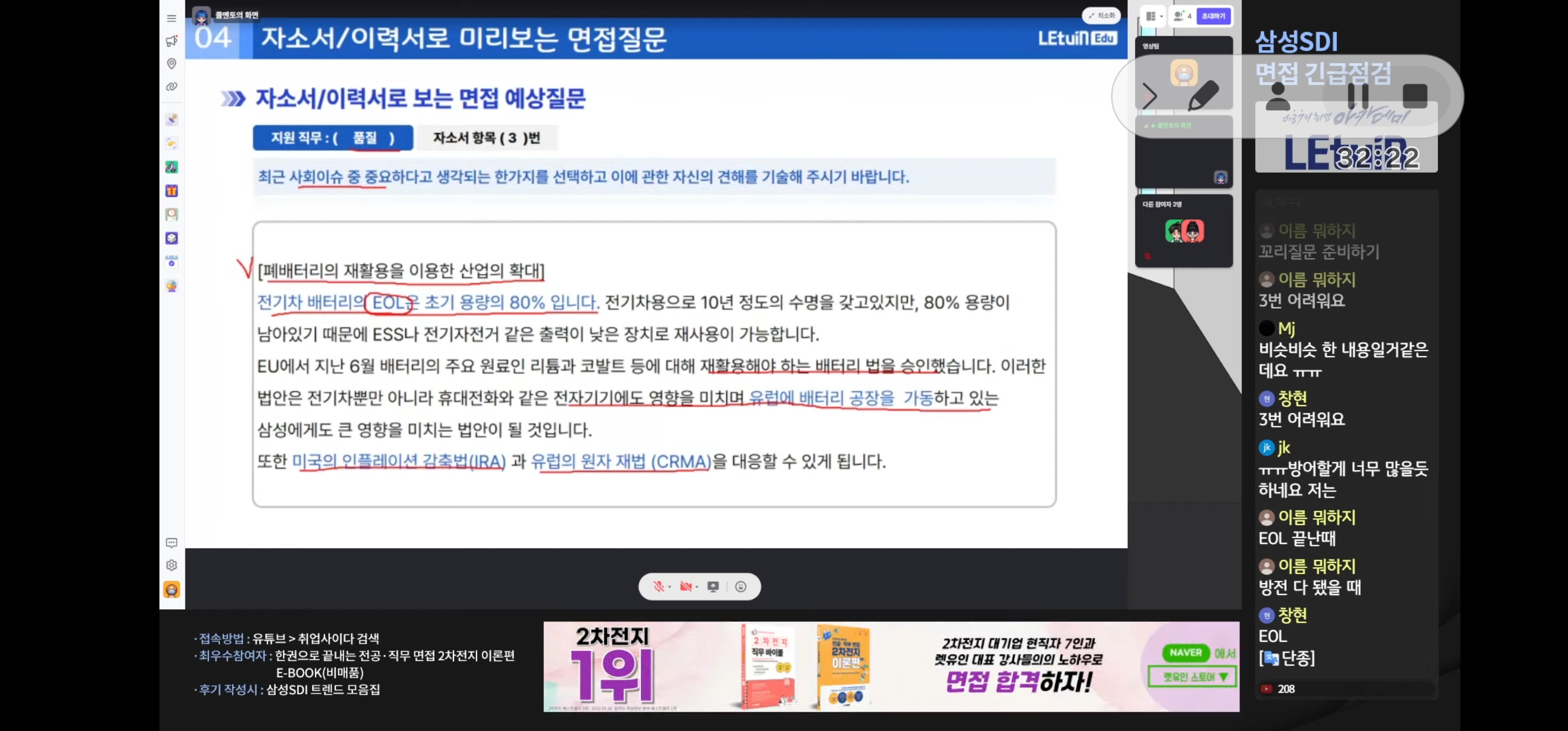 삼성 SDI 면접을 대비해서 알아야할 부분들, 지원한 분야에서 핵심적으로 알아야할 요소에 대해 알 수 있었음. 또한 BOL, MOL, EOL등 필수적으로 알아야할 단어 및 용어에 대해 배울 수 있었습니다.