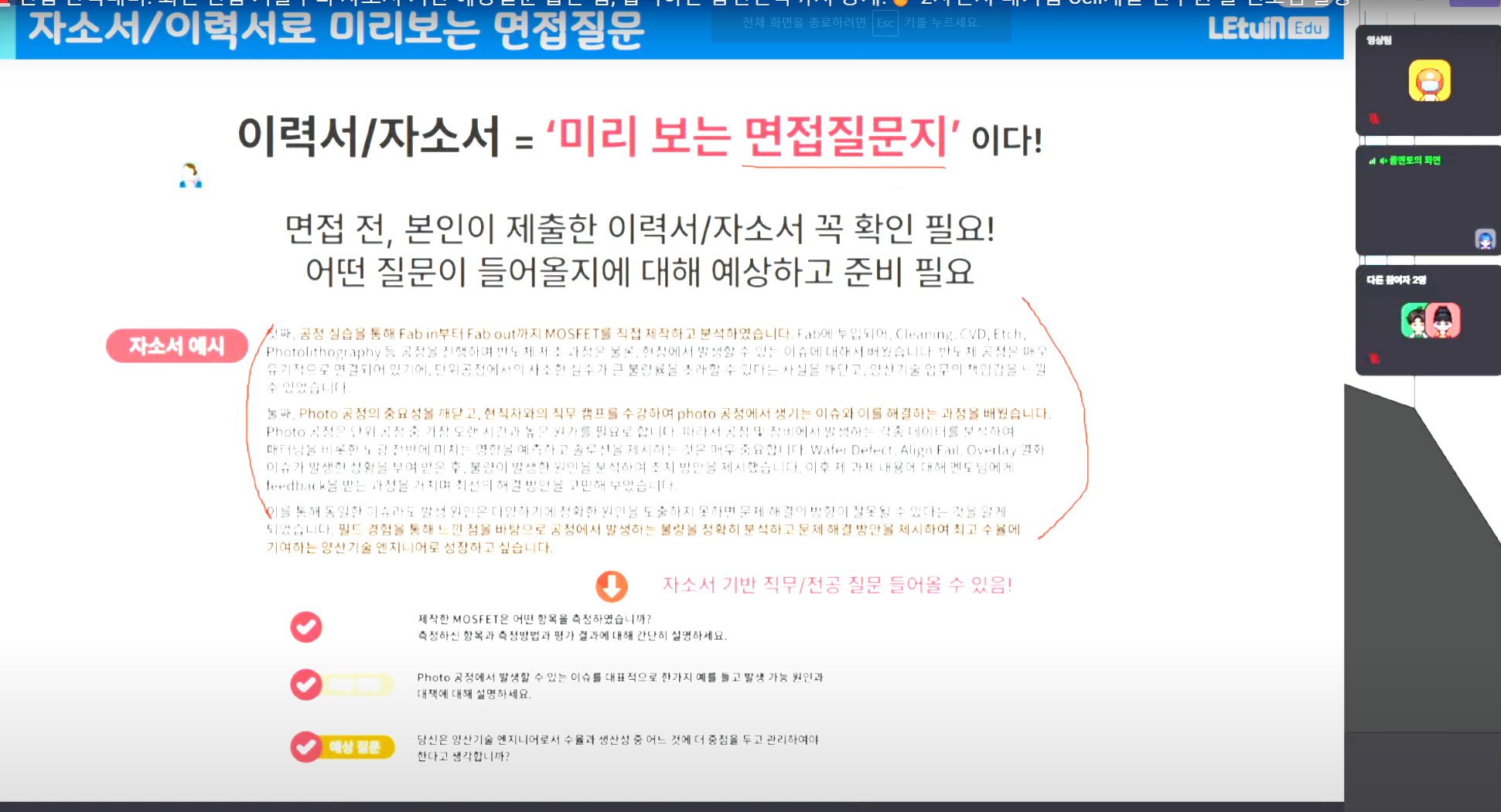 직무 면접 핵심 포인트, 기출질문 정리, 직무면접에서 공통적으로 물어보는 것들 등등 면접에 전반적으로 필요한 내용에 대해 설명해주시고, 요즘 이슈에 대해서 간단하게 집어주셔서 좋았습니다.