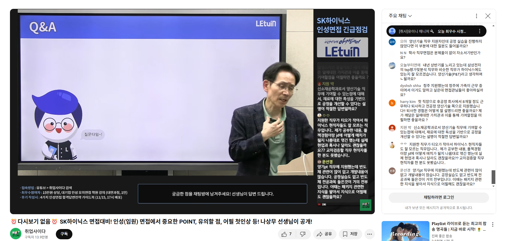 이력서 질문 삼성과 차이점 전통적인 인성질문 함께 일하고 싶은 사람의 특징 지원동기 + 직무 노력 경영철학 등 에 대해서 알 수 있었고 각 항목별로 답변 예시를 알 수 있어서 유익했습니다. 생방송 시청 인증 이미지
