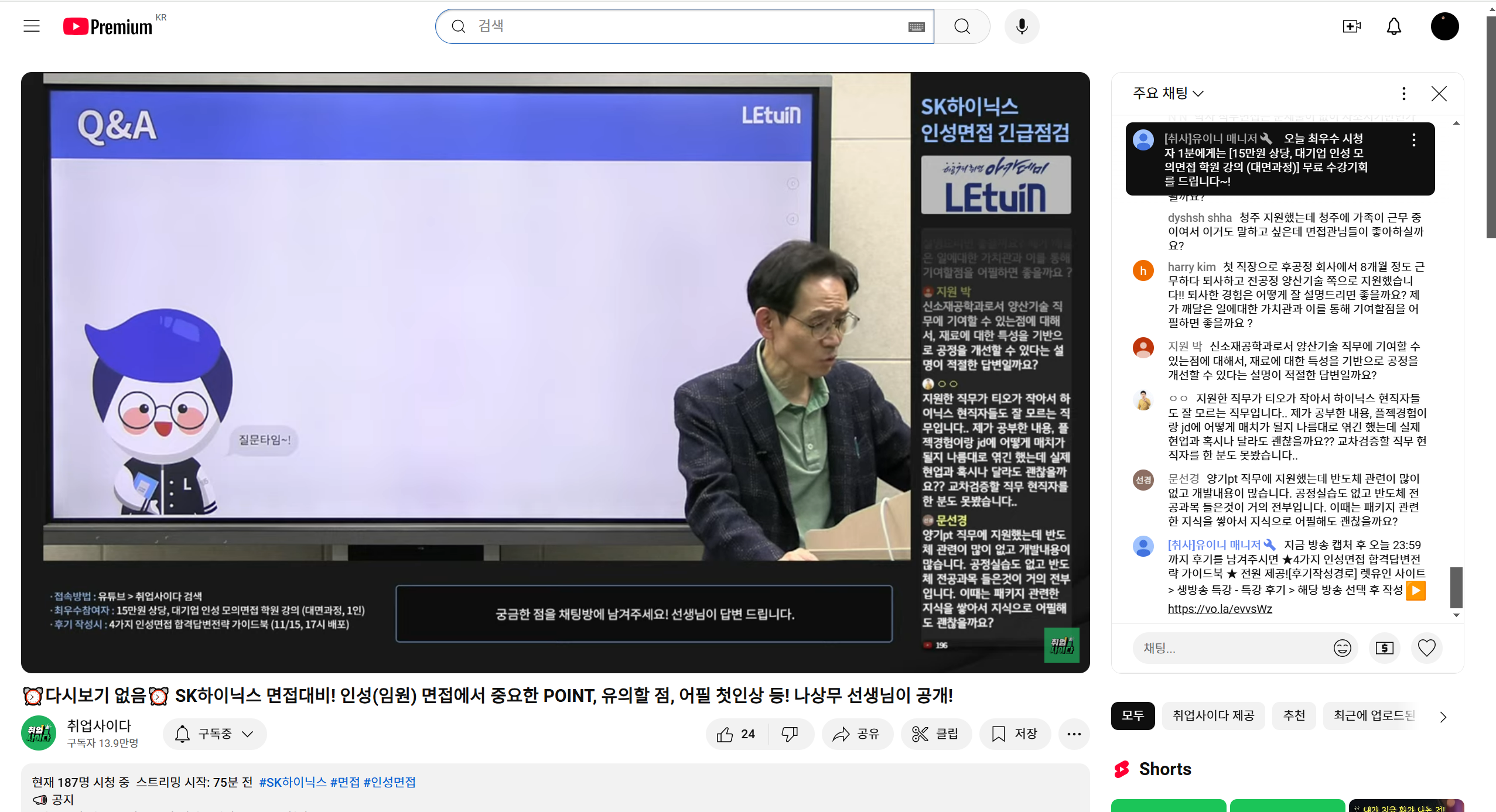 특히 마지막에 직접 질의응답해주신 부분이 너무 도움이 많이 됩니다. 면접안내 pdf파일에서 놓치고 있는 부분을 강조해주셔서 너무 감사합니다. 생방송 시청 인증 이미지