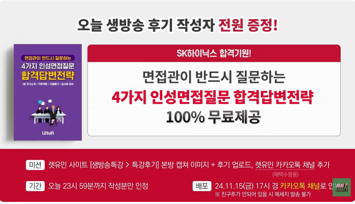 하이닉스 면접이 처음이어서 어떻게 대비해야 할지 불안했는데, 오늘 강의를 듣고 어떤 강점을 어필하고 어떤 기준으로 답변을 해야할지 잘 알수있어서 유익했습니다. 오늘 강의내용 잘 복기해서 꼭 면접 합격할 수 있도록 계속 연습하겠습니다.