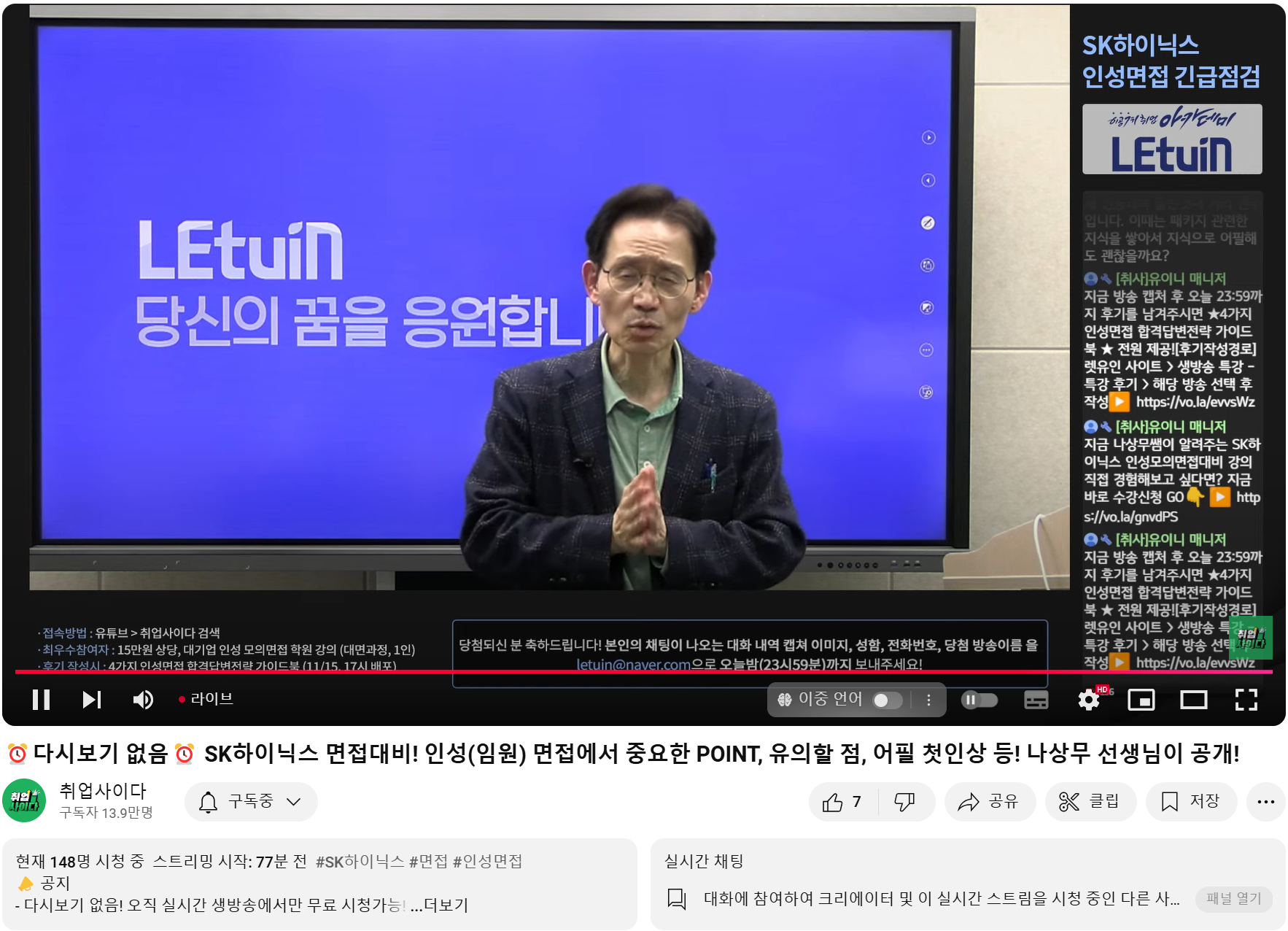 해당 부분을 나상무님께서 잘 말씀해주셔서 방향성이 잡힌것 같습니다. 가이드라인을 조금 더 읽고 내재화 해서 이를 언어로 잘 풀어가는 연습이 필수적인 것 같고 이 부분을 연습해서 임원면접을 잘 준비해 보겠습니다. 생방송 시청 인증 이미지