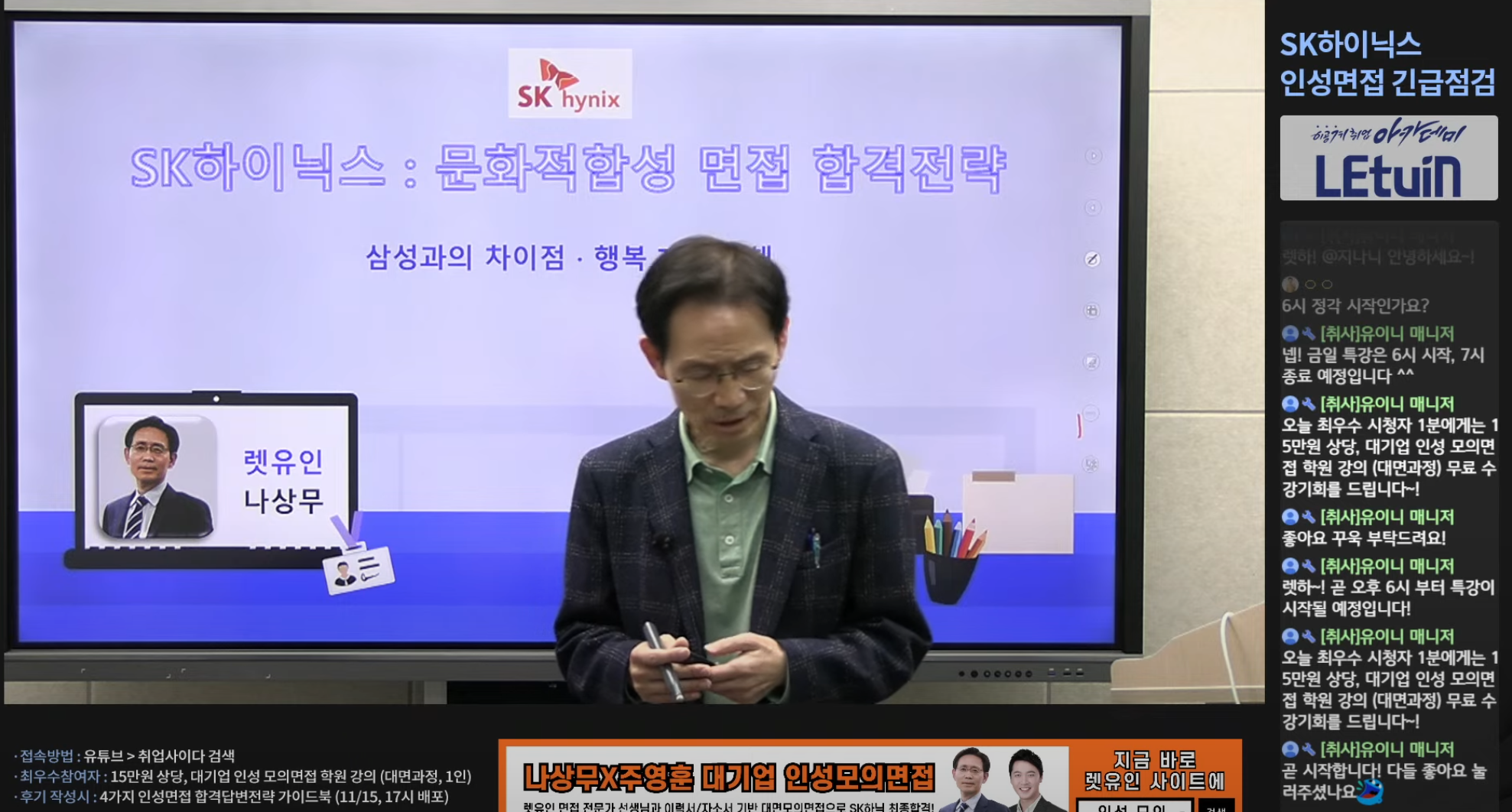 갑작스럽게 하이닉스 문화적합성 면접 긴급점검을 열어주셔서 감사합니다. 이 영상을 통해 앞으로의 면접에 대해 잘 준비할 수 있을 것 같습니다. 강연중에서 강조하신 내용 준비하면서 면접 준비해나가겠습니다. 다시 한 번 이렇게 준비해주셔서 감사합니다.