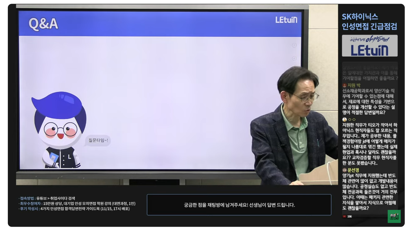 특히 질의 응답 중 pt의 경우 main과 sub 주제 중 직무와 연관 되어 있는 부분을 중심으로 서술 하는것이 중요하다는 것을 알게 되었습니다. 감사합니다. 생방송 시청 인증 이미지