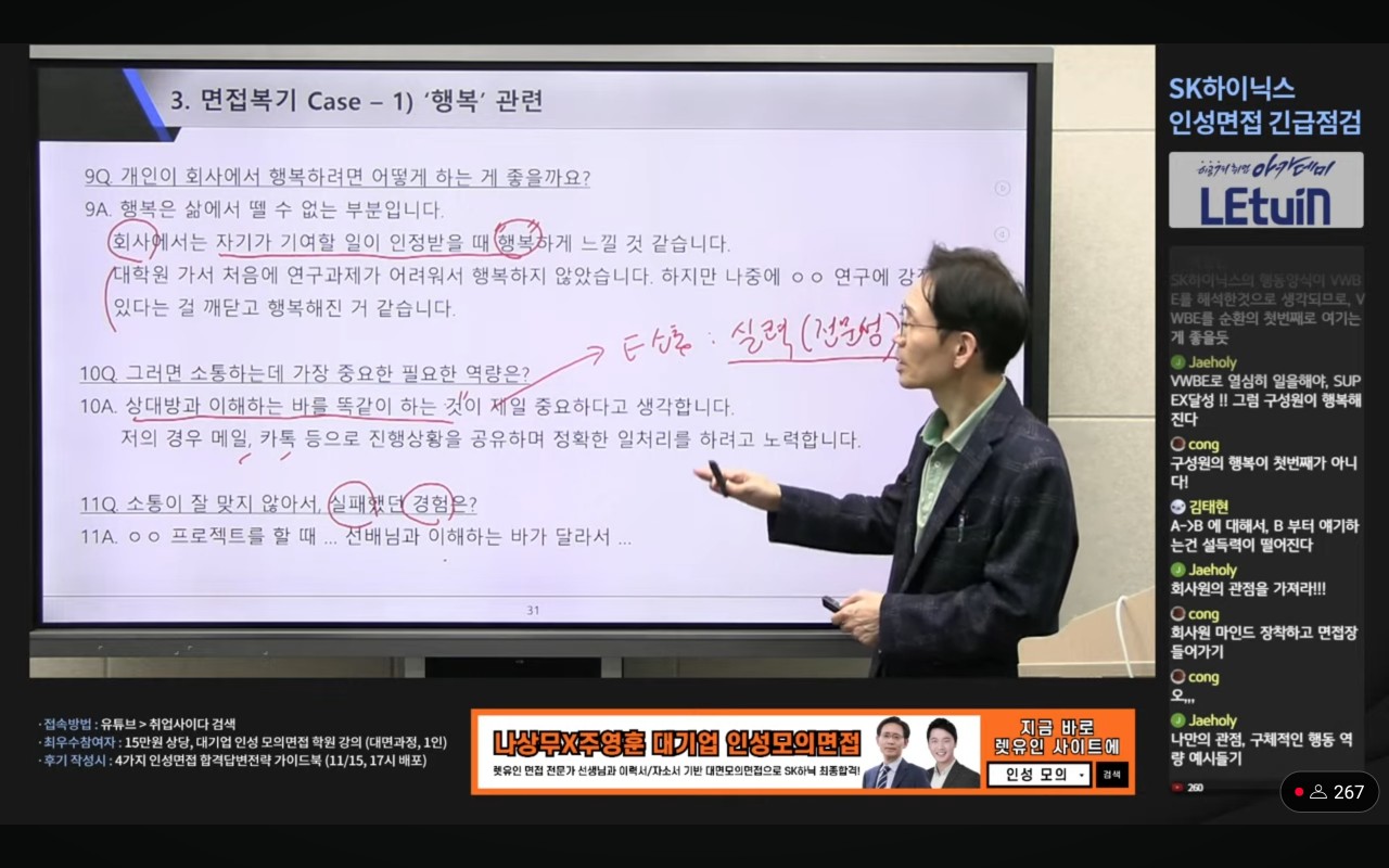 SK하이닉스 면접을 준비하면서 어떠한 식으로 준비해야할 지 막막했었는데, 이번 특강을 통해 어느정도 방향성을 잡을 수 있었던 것 같습니다. 특히, 다양한 경영철학에 대한 생각과 경험을 정리하여 제대로 준비해야겠다는 다짐을 하였습니다.