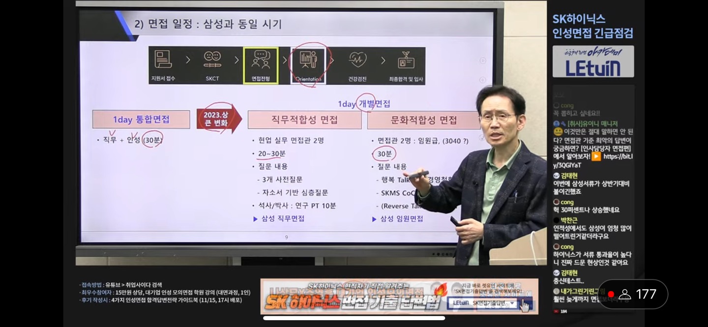 뿐만 아니라 sk하이닉스의 면접의 특징을 알기 쉽게 정리해 주셔서 좋았습니다. 하이닉스 면접에 대한 정보가 부족하여 방향성을 설정하기 어려웠는데 특강을 들으며 준비방향을 잡을 수 있었습니다. 생방송 시청 인증 이미지