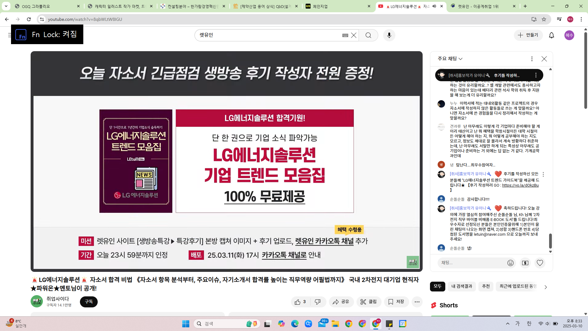 LG에너지솔루션 채용에 관한 특강이었습니다. 자소서 항목에 관해서 어떻게 작성해야 하는 지를 알려주셨고, QNA를 통해서도 구체적으로 작성 방법을 알려주셨어요!! 바뀐 채용 분야에 대해서 구체적인 확신이 필요할 것 같습니다.