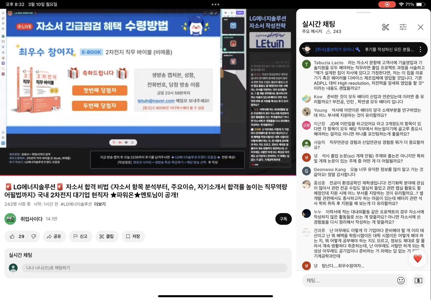 또한 문항별로 자소서 작성법에 대해 자세히 알려주신게 도움이 많이 되었습니다. 생방송 시청 인증 이미지