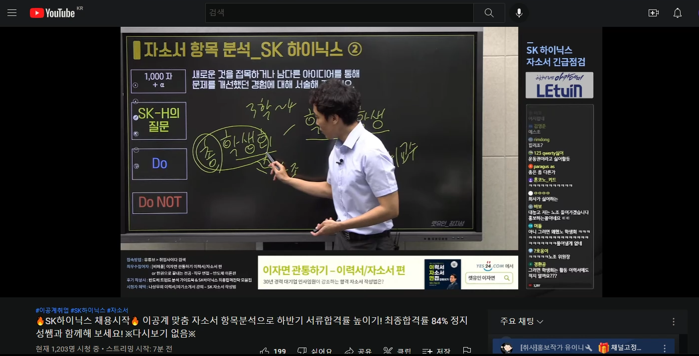 [생방송 특강 수업내용] 1번 항목 - 오래 회사에 근무할 수 있는 인재를 판별하기 위한 항목으로 난이도와 강도가 공감되는 경험 작성 2번 항목 - 문제를 개선한 경험 또는 방법론을 중심으로 다른 소재와 분리하여 작성 3번 항목 - 직무에 대하여 얼마나 알고 있고 관련 경험이 있는지를 작성하되 자충수펙과 인성역량은 지양할 것 4번 항목 - 인간 관계에 대한 내용으로 '소통'에 대한 내용을 작성할 때 최대한 구체적으로 기입할 것 [수강 후기] 무료 강의임에도 불구하고 항목별로 상당히 자세하게 분석하여 설명을 해주셨고 본인과 수강생들의 예시를 들어 설명해 주신 덕분에 이해가 잘 되었습니다. 강사님의 유머러스한 강의 방식덕분에 1시간 반이라는 시간동안 집중하여 강의를 들을 수 있었습니다. 좋은 수업 감사합니다. ※ 본 게시글은 2022.08.22 진행된 정지성 선생님의 2022년 하반기 대비 SK하이닉스 자소서 긴급점검 특강에 대하여 렛유인 카페에 남겨주신 생방송 특강 시청 후기입니다.