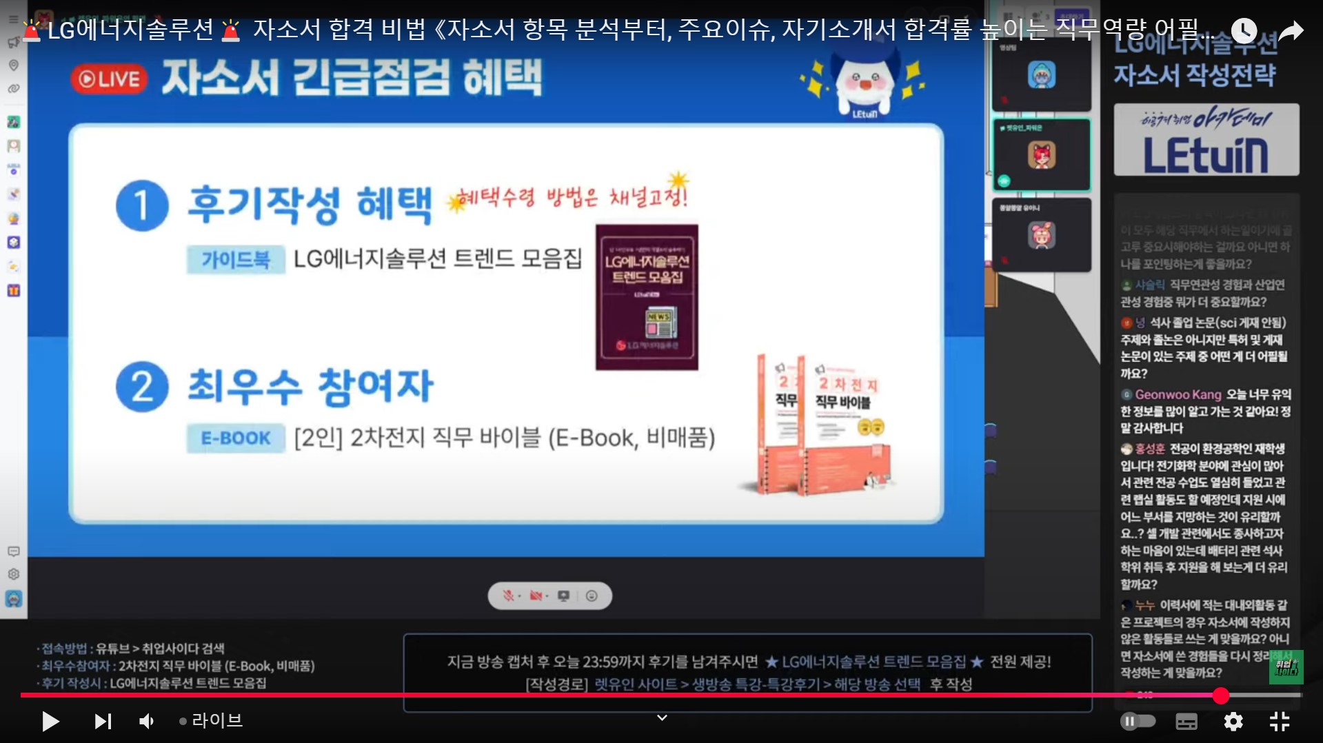 각 전지 종류별로 특징을 알려주셔서 이해하기 편했습니다. 학, 석사 동시채용 부문은 데이터를 추출하여 가공하여 의미있는 결과를 도출한 경험, 실험장비를 이용해본 경험을 어필하면 좋을 것 같다고 하셨습니다. 생방송 시청 인증 이미지