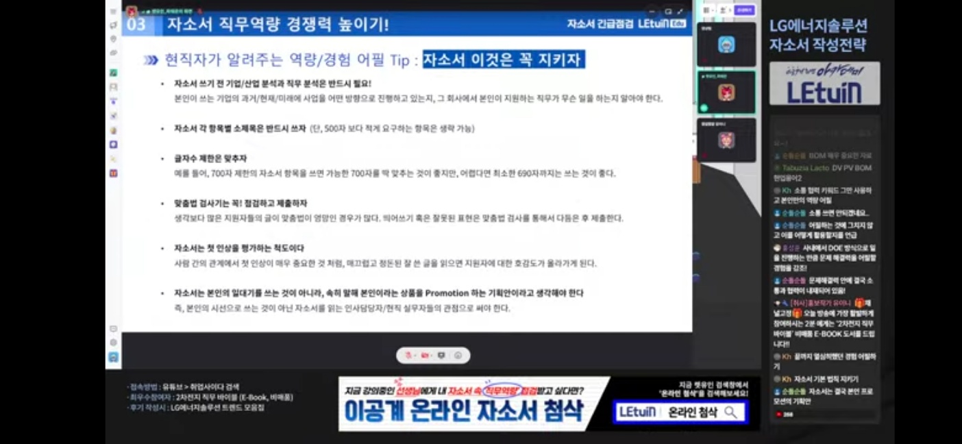 LG 에너지 솔루션 자소서를 어떻게 써야하는지 항목별로 설명을 해줘서 유익했다. 직무에 대한 이해와 지원 동기를 구체적으로 작성하는 것이 중요하다. 직무 수행에 필요한 핵심 역량을 어떻게 갖추었는지가 중요하다.