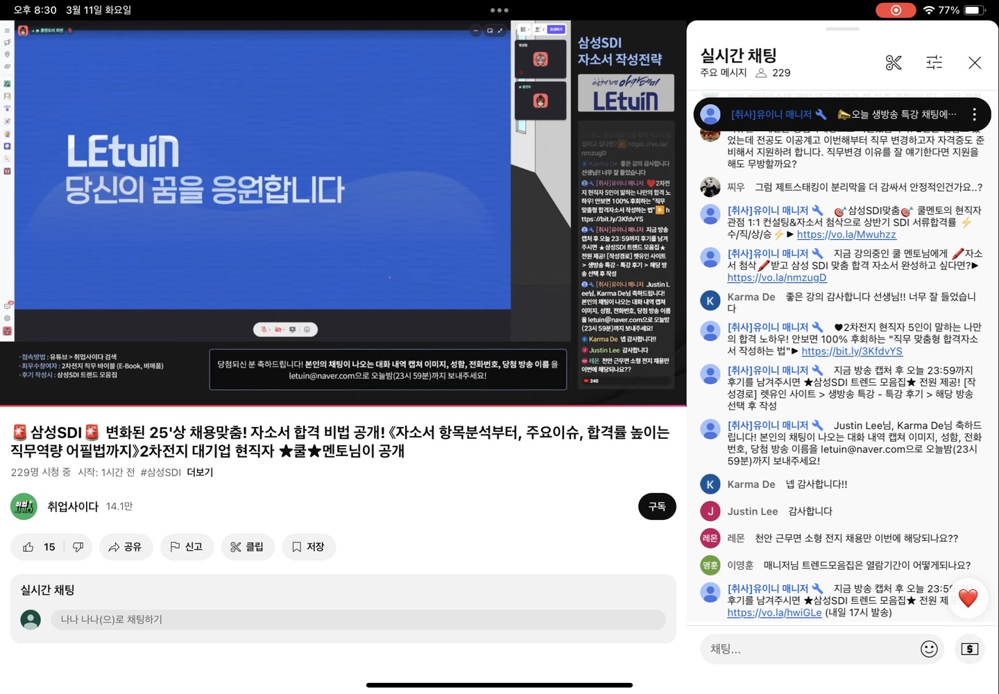 배터리 제조공정에 대해 자세하게 설명해주셨고 sdi의 핫이슈에 대해서도 알려주셔서 산업 이해에 많은 도움이 되었습니다. 그리고 자소서 항목별로 자소서 작성 방법에 대해서도 자세히 강의해주셨습니다.