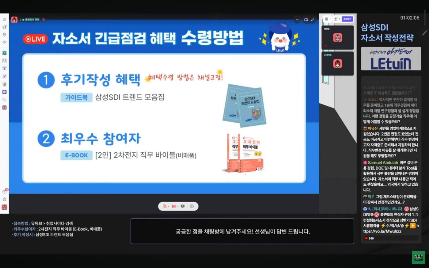 이번 채용을 진행하는 삼성 SDI 기술직 직무에 대한 내용과, 실제 직무중 사용되는 개념 및 용어들, 그리고 지원하기 위한 자소서 항목들에 대한 자세한 내용들을 알 수 있었습니다. 또한 Q&A 과정을 통해 궁금했던 내용들을 알 수 있어 매우 유익한 강의였습니다.
