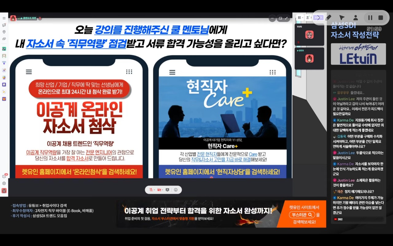 취업 시장이 좁아지면서 삼성SDI 또한 직무가 많이 줄어든것을 느꼈습니다. 이번 강의를 통해 많은 도움을 주셔서 감사합니다!!!! 생방송 시청 인증 이미지