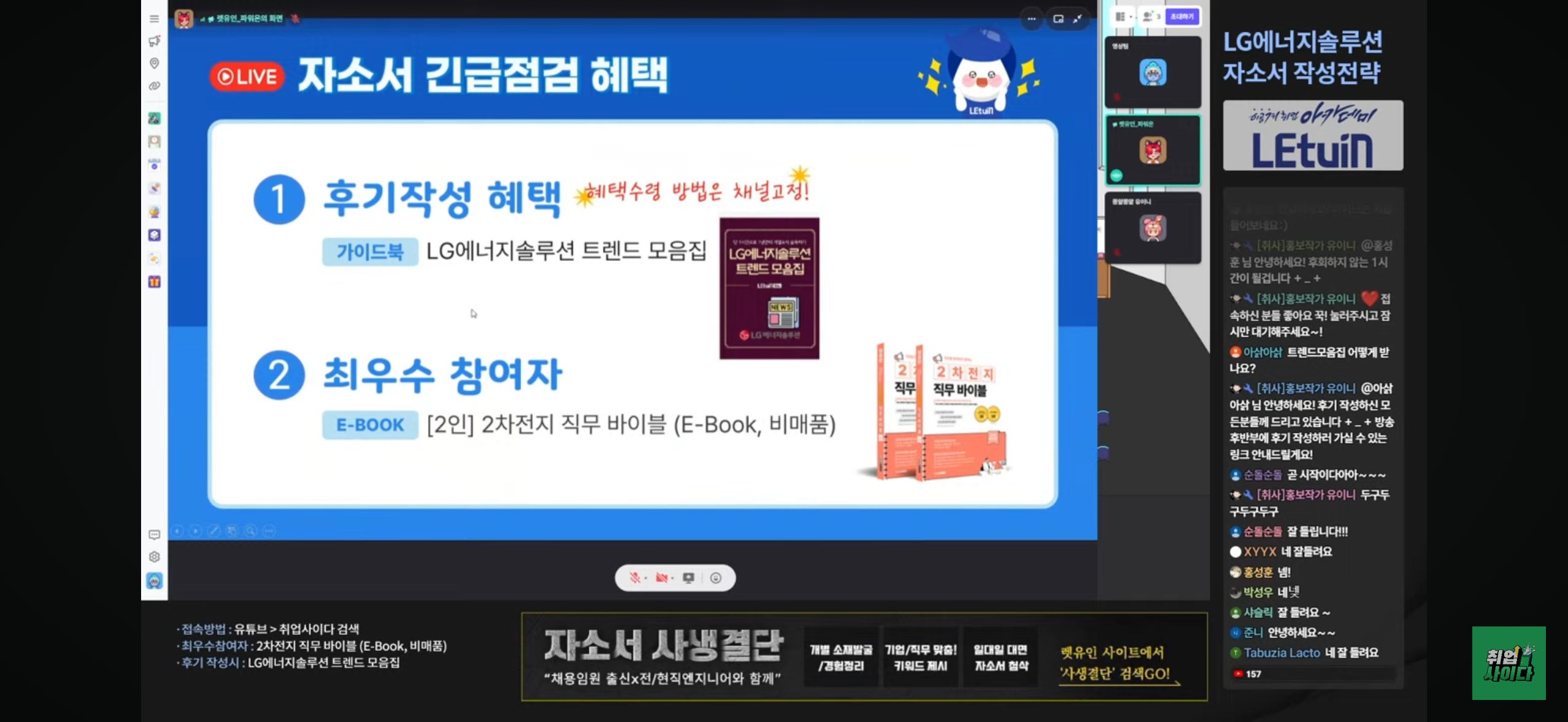 -상반기 채용 특이점 -채용 직무 살펴보기 -2025 상반기 채용 J/D 살펴보기 02. 엔솔 핫이슈 -엔솔-GM 각형 셀 공동 개발 03. 자소서 직무역량 경쟁력 높이기 -자소서 작성시 알아둘 만한 현업 용어 -현직자가 알려주는 역량/경험 어필 tip 04. 엔솔 항목별 자소서 작성 전략 -잘 쓴 자소서는 이렇게 쓰여 있다. P.R 3. 수강후기