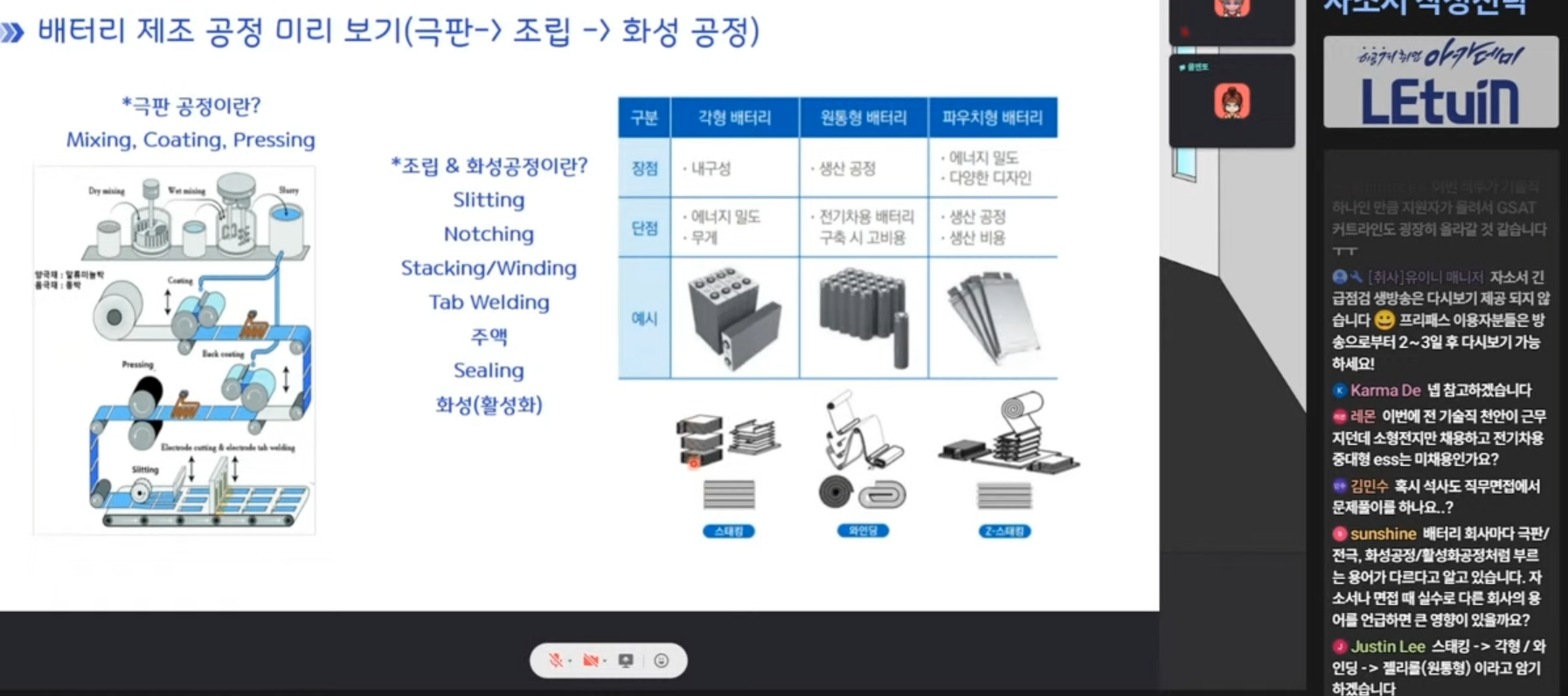 배터리 공정쪽 전과정의 요약과 각 배터리 종류별 만들어지는 공정, 자기소개서의 best case와 worst case를 나누어 보여주어, 이해가 수월하였습니다. 다른 강의처럼 ~~식으로 써야한다. ~~시긍로 쓰면 안된다. 이런것보다 직접 예시를 가져와서 보여주었습니다.