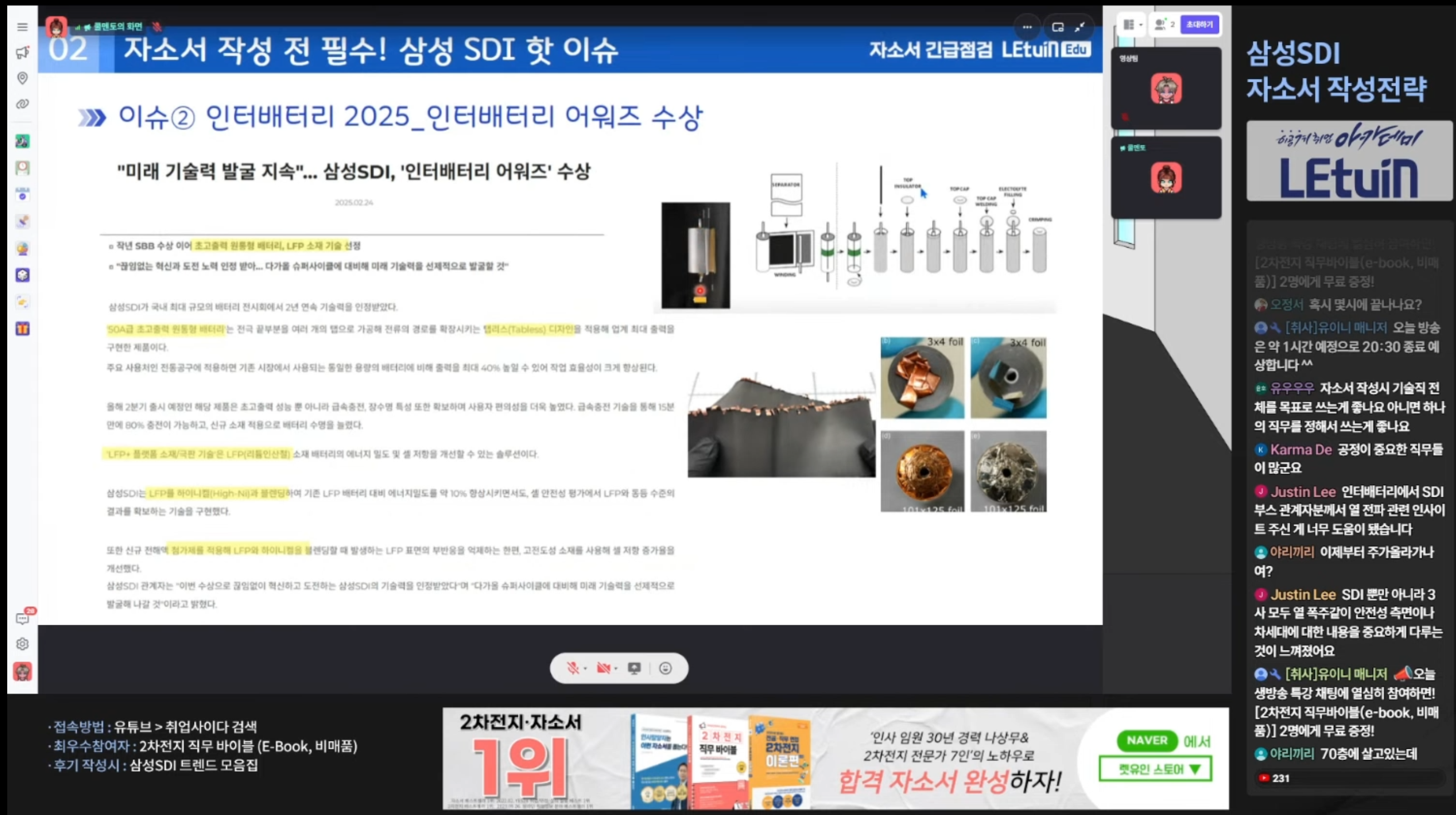 오늘의 자소서 긴급점검 역시, 배터리 공정에 대한 전반적인 요약과 Job Discription에서의 주목할 점, 그리고 합격 자소서를 예시로 들어 자소서 작성 방향에 대한 전반적인 방향을 잡아주신 것 같아 많은 도움이 될 것 같습니다.