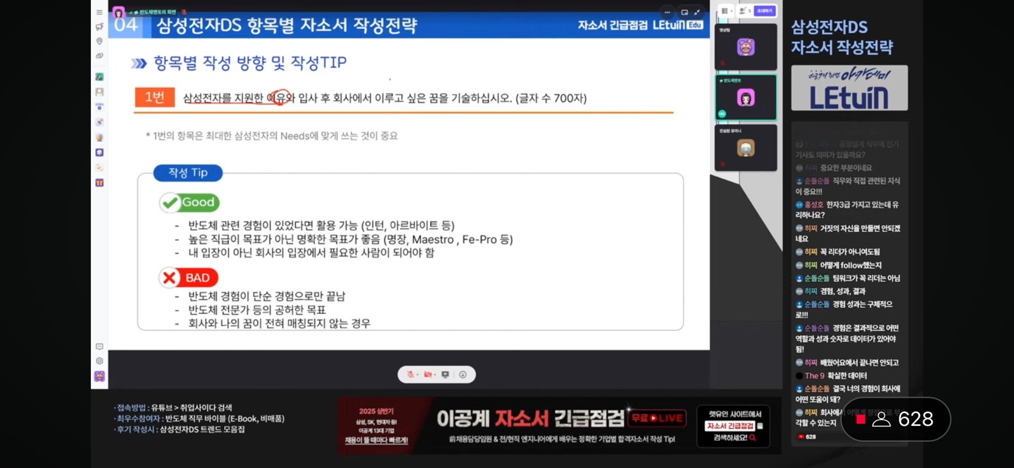 1번 문항 : 반도체 관련 경험을 어필. 단, 단순 경험으로만 끝나면 안된다 2번 문항 : 주변 사람들의 평가나 내용이 아닌 자신만의 story 가 중요하다 3번 문항 : 꼭 반도체가 아니라 평소에 진짜로 관심 있었던 주제를 선택하는 것이 더 중요하다 4번 문항 : 직무와 연관성이 있고 두루뭉술하지 않게 어필하는 것이 중요하다. 3. 수강후기