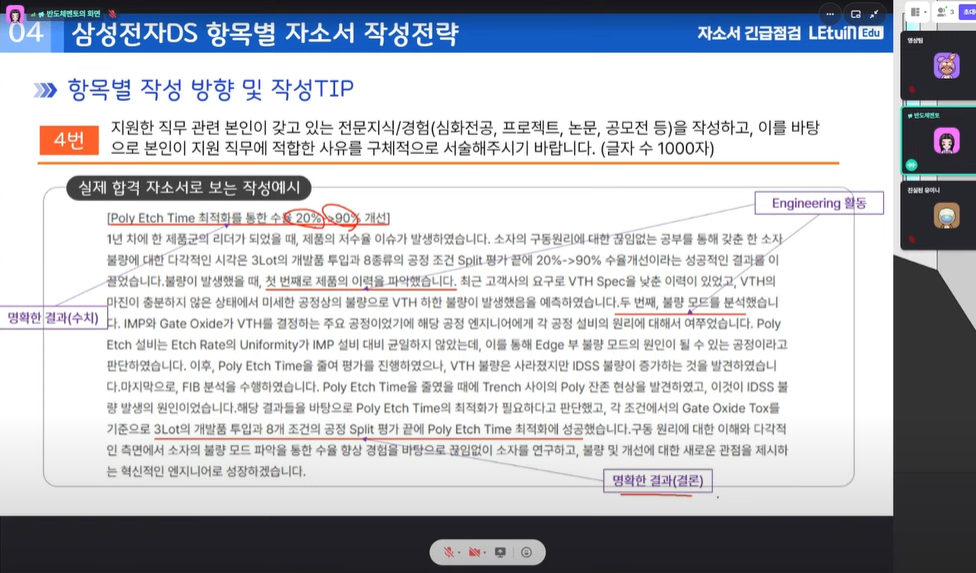 자기소개서 항목 분석 및 작성 전략: 각 항목에서 요구하는 역량과 경험을 효과적으로 어필하는 방법. 직무별 핵심 역량 및 합격률 높이는 어필법: 반도체 엔지니어링 직무에 필요한 기술적 역량과 문제해결 능력 강조법. 삼성전자 주요 이슈와 연관 지은 직무 3. 수강후기