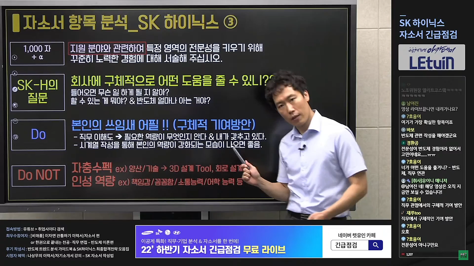 [생방송 특강 수업내용] 1번 문항은 내 반도체 역량보다, 내가 자발적으로 사서 고생한 경험이 있는지 회사에서 오래 버티며 노력할수있는지 묻는 문항이고, 2번 문항은 '문제를 개선했던 경험' 에 주를 두어야 한다. 남다른 아이디어에 집착하지말고 내가 문제 상황에 어떻게 대처하는지 개선!한 경험과 방법을 써야함. 특히 여기에 괜히 다른 소재랑 섞어내지 말기! [수강 후기] 갑자기 울린 렛유인 카톡 알림으로 갑자기 들어가서 시청하게 되었습니다. 정말 문항이 많아서 정말 막막하고 답답했던 SK하이닉스 자소서였는데, 선생님의 특강 덕분에 하이닉스 자소서가 무엇을 묻는 것인지, 어떻게 대처해야 하는지 정확히 알았습니다. 또 초반 자주 묻는 질문에 제가 궁금했던 모든 질문들이 있어 신기했고 덕분에 좋은 해결책 얻어가서 속시원하네요! ※ 본 게시글은 2022.08.22 진행된 정지성 선생님의 2022년 하반기 대비 SK하이닉스 자소서 긴급점검 특강에 대하여 렛유인 카페에 남겨주신 생방송 특강 시청 후기입니다.