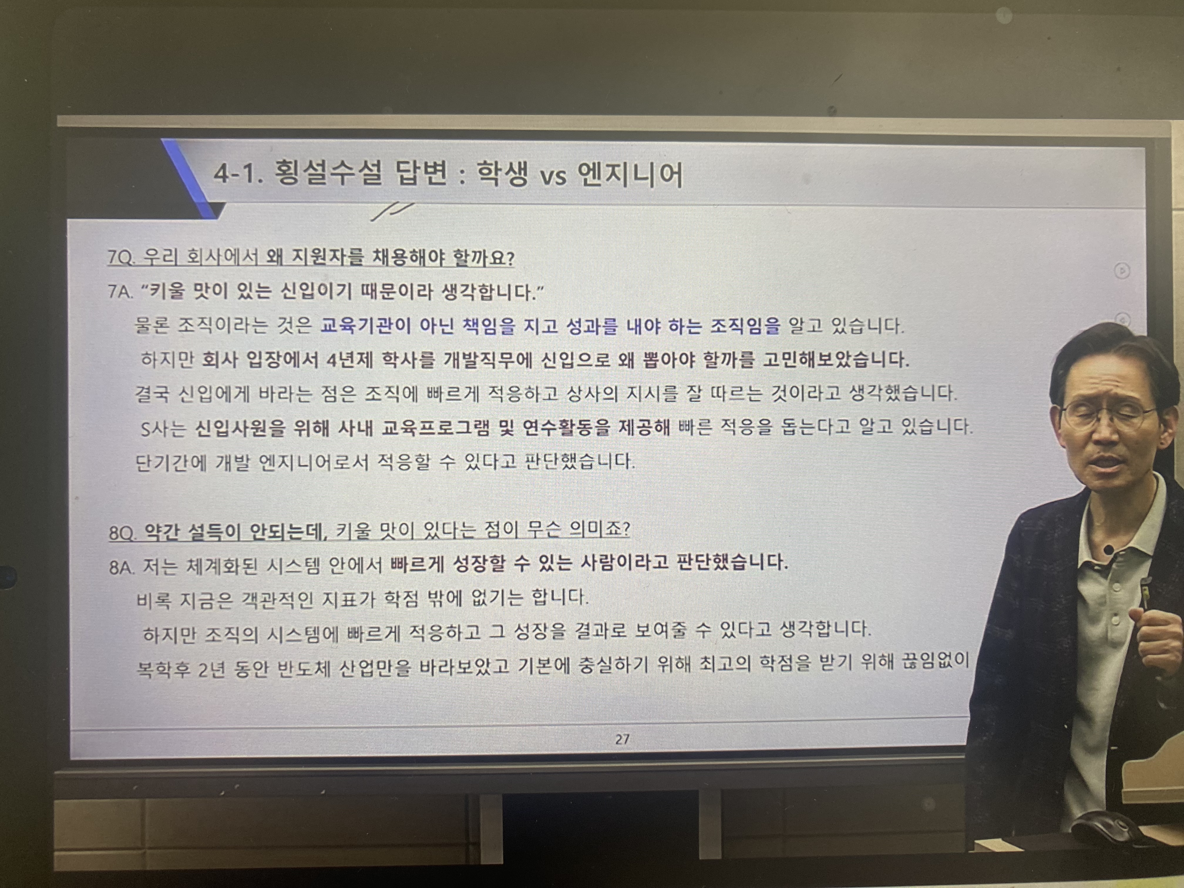 먼저, 삼성과 SK의 면접 진행 방식, 면접관 수와 진행 시간에 대한 전반적인 설명이 있었습니다.