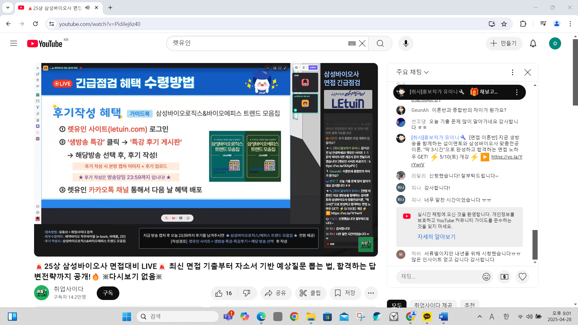 섭이님의 자소서 특강부터 면접 기출까지 유일하게 챙겨듣는 취준 라이브입니다 ㅠㅠ