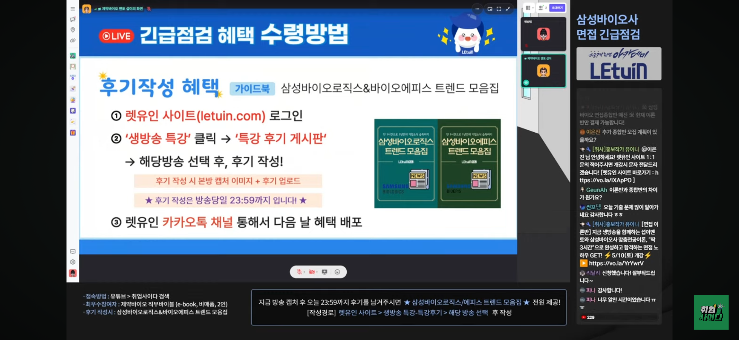 사전 문제 풀이(1시간)->대기->직무면접(30분)->대기->인성면접(30분) 면접 질문이 어떤식으로 나오는지 ex) 지금 한 말 영어로 해보세요 공부 어떻게 하면 되는지 생물공정공학, 분자생물학, 생화학, 삼바 홈페이지 설명해주셨습니다! 3. 수강후기