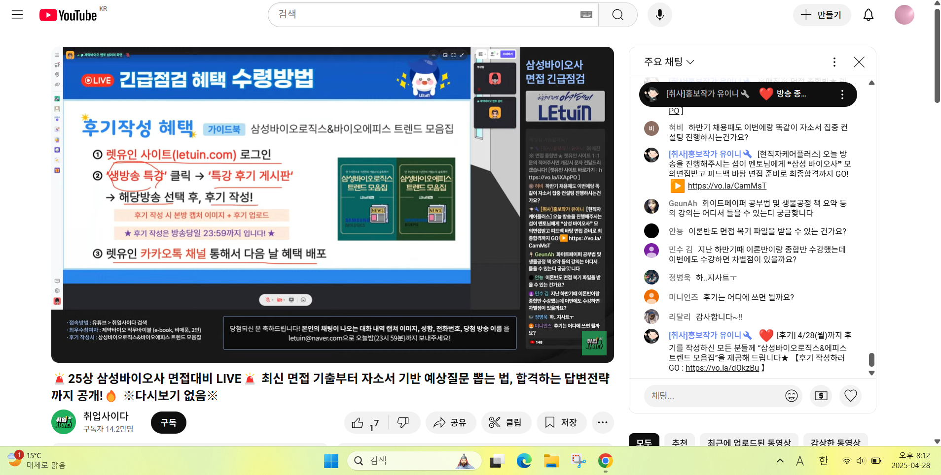 특히 직무면접을 위해 어떤 부분을 공부하면 좋은지 등 정말 많은 정보를 얻었습니다. 좋은 특강을 준비해주셔서 감사합니다. 생방송 시청 인증 이미지