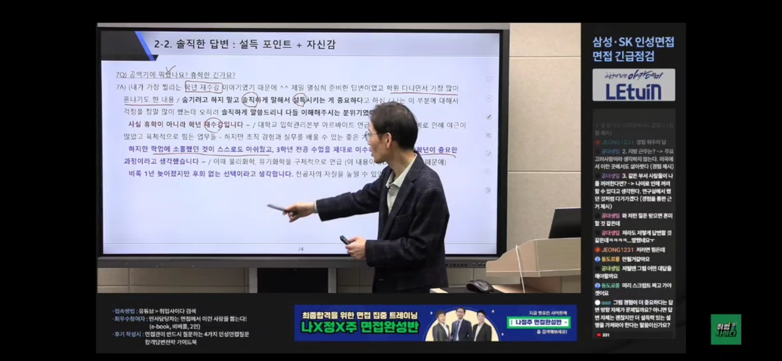 대기업의 면접 구조부터 삼성과 SK의 면접 차이점을 표를 통하여 자세히 설명해주셔서, 가고자 하는 회사의 면접 분위기 및 질문 수준을 파악할 수 있었습니다. 면접 답변에 대한 보완점을 알려주셨습니다.
