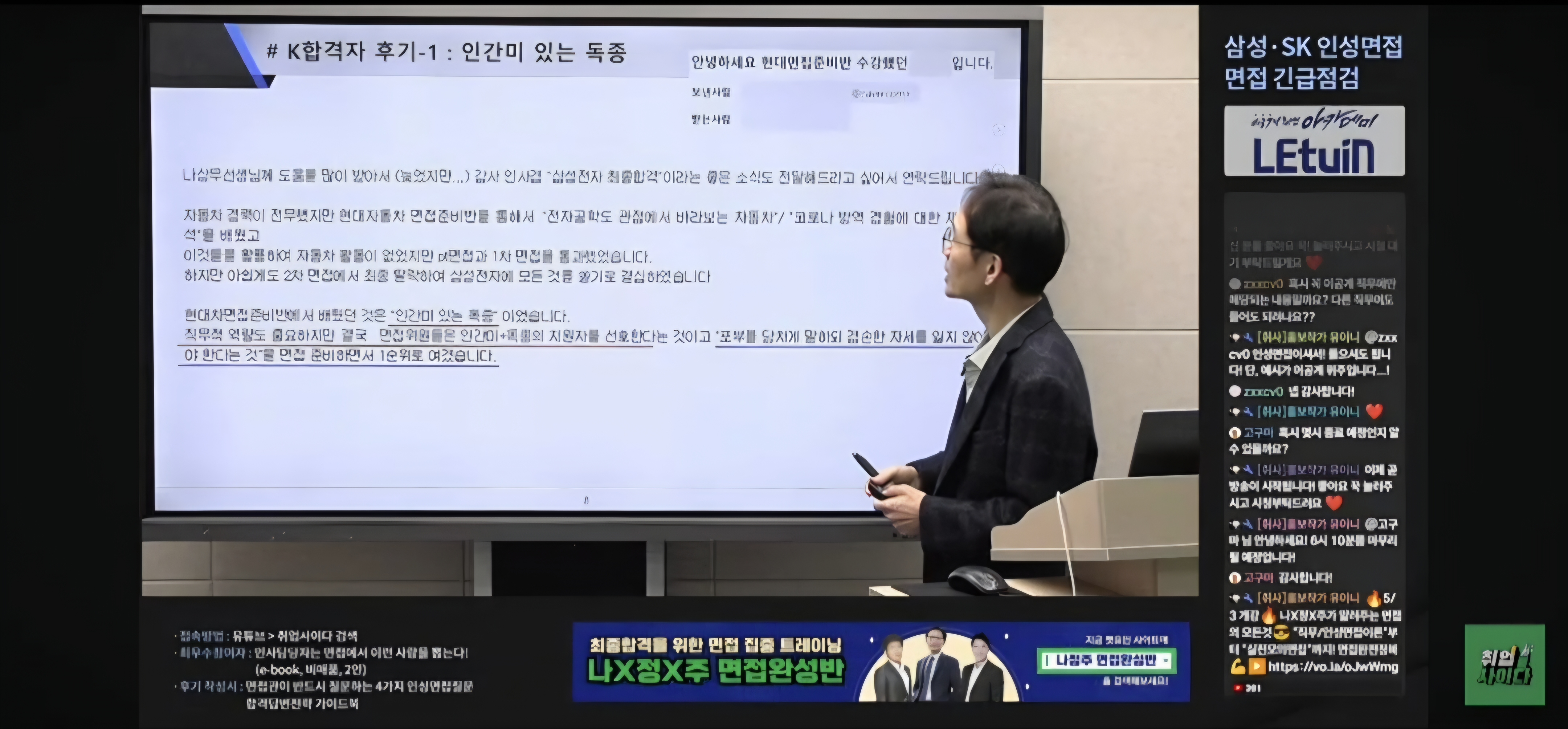 렛유인 특강은 항상 다 퀄리티가 좋고 실질적으로 도움이 많이 되는 강의들인것 같습니다. 지금처럼 취업에 도움되는 특강 계속 부탁드립니다!! 나상무 선생님의 자소서 책도 구매 후 도움 많이 받았는데 면접 책도 구매해볼까 합니다!