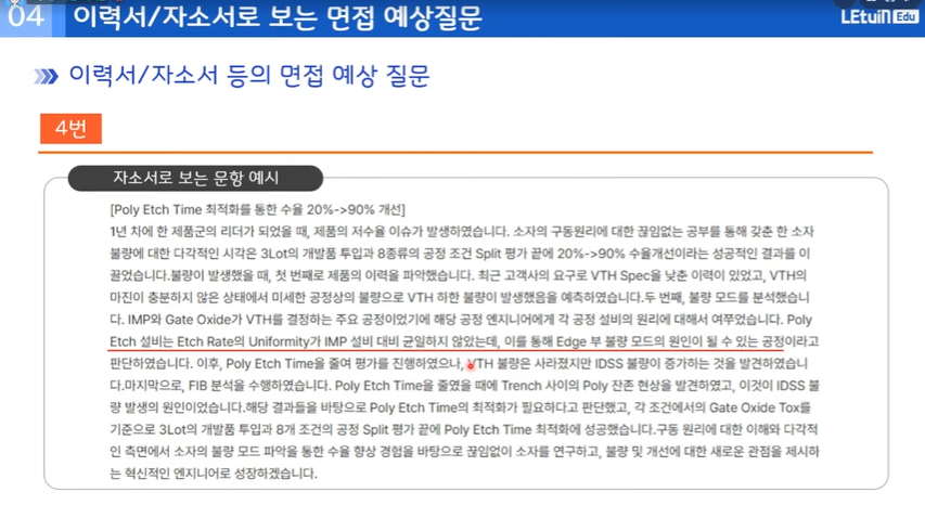 직무 면접에 대한 구체적인 방식과 해결법을 알 수 있었습니다. 또한 어떤 부분을 어필하고 답변구조를 어떻게 해야하는 지에 대한 도움을 받을 수 있었습니다. 작성한 자기소개서의 예상 질문을 구체화할 수 있었습니다.