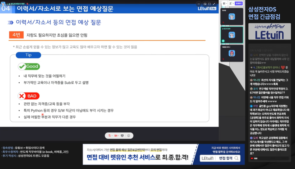 본인의 경험을 녹여내며 진솔하게 이야기해주신 부분이 인상 깊었고, 막연한 두려움 대신 구체적인 전략을 갖고 준비할 수 있게 되었습니다. 예시를 들어 어떻게 면접 준비를 해야할지 감을 잡을 수 있었습니다.