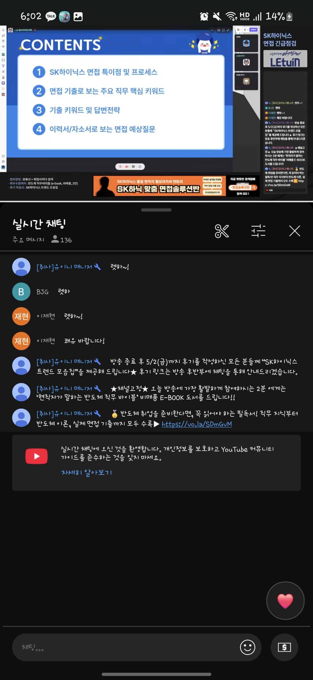 하이닉스 면접 준비라는 과정 자체가 막연하고 어떻게 시작해야할 지 막막했는데 해당 특강을 통해서 방향성을 잡을 수 있었고 sk하이닉스 뉴스룸 등의 좋은 소스도 알 수 있어서 좋았습니다.