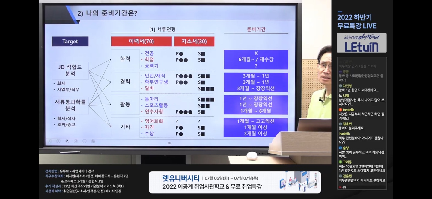 ※ 본 게시글은 2022.07.05 진행된 나상무, 정지성, 주영훈 선생님의 렛유니버시티 이공계 취업사관학교 후기 특강에 대하여 렛유인 카페에 남겨주신 생방송 특강 시청 후기입니다.