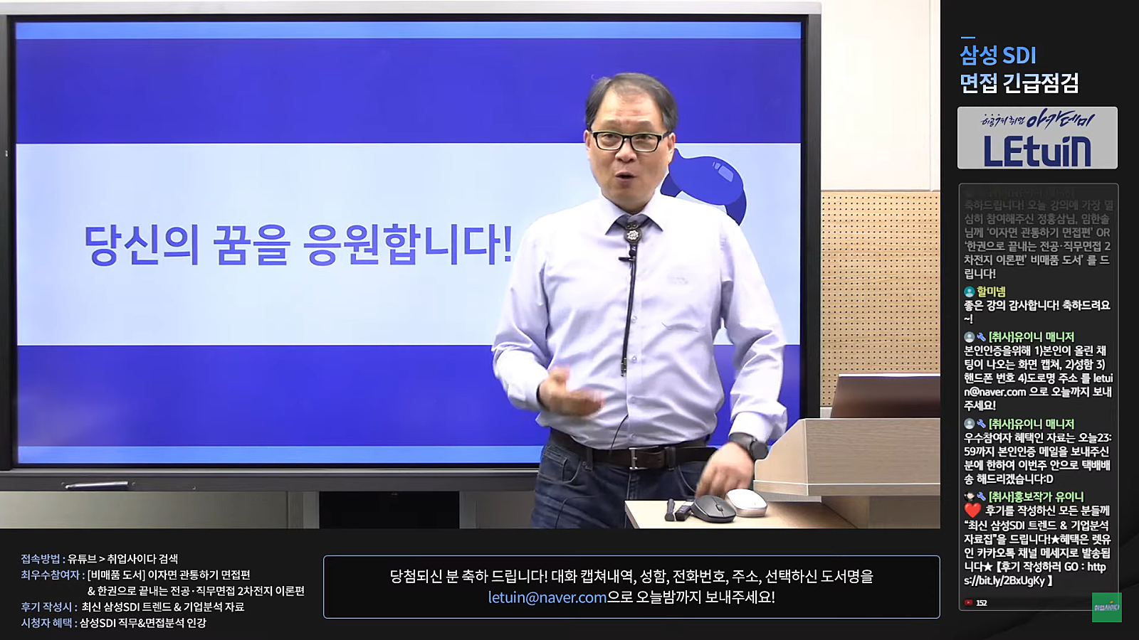 ※ 본 게시글은 2022.05.23 진행된 안재형 선생님의 2022년 하반기 대비 ‘무료 라이브 취업특강 - 삼성SDI 면접기출 & 모범답변 긴급점검’ 특강에 대하여 렛유인 카페에 남겨주신 생방송 특강 시청 후기입니다.