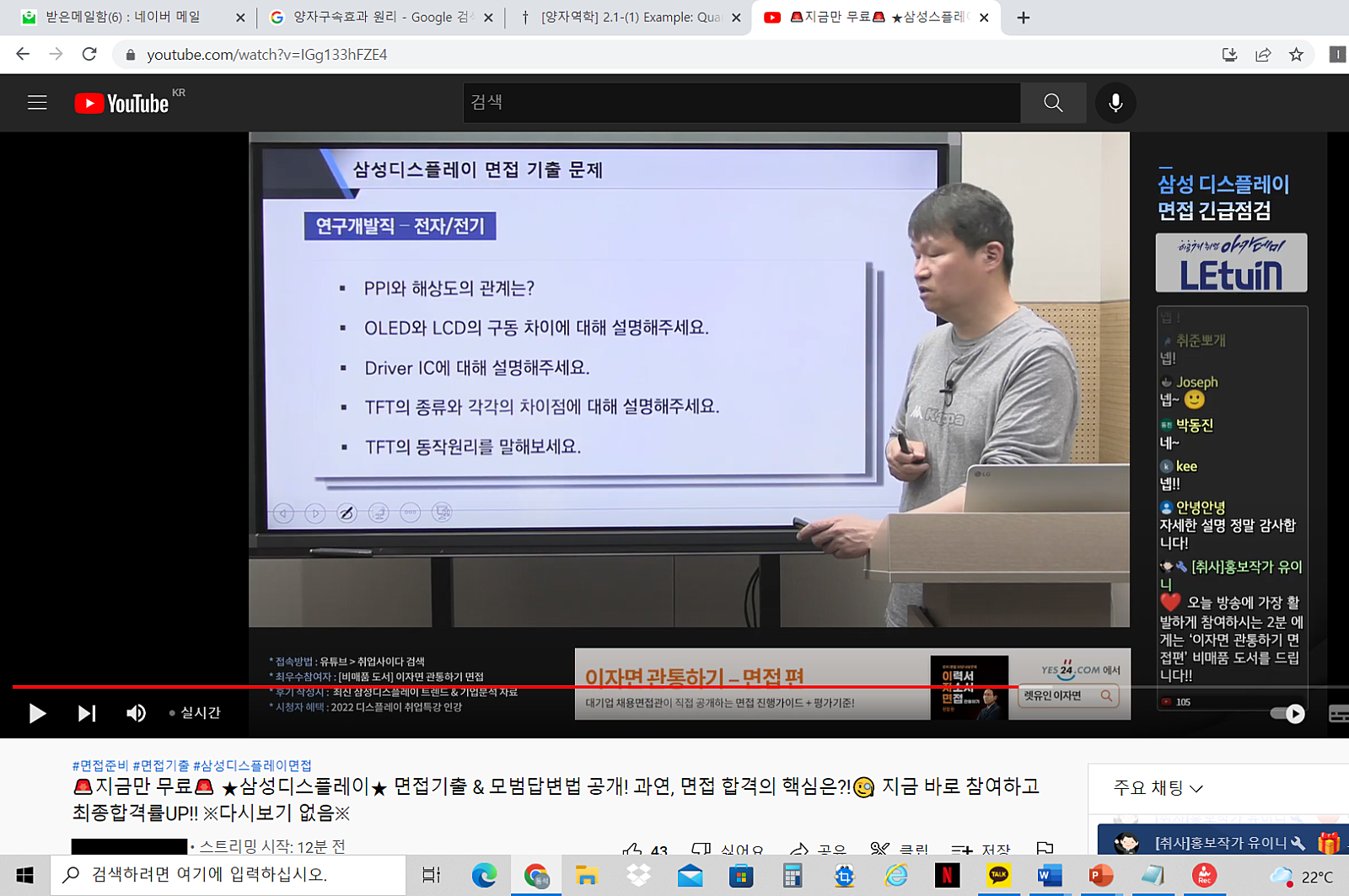※ 본 게시글은 2022.05.19 진행된 이광원 선생님의 2022년 하반기 대비 ‘무료 라이브 취업특강 - 삼성디스플레이 면접기출 & 모범답변 긴급점검’ 특강에 대하여 렛유인 카페에 남겨주신 생방송 특강 시청 후기입니다.